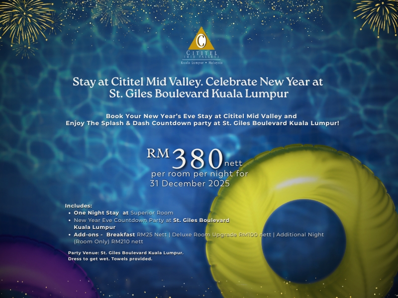 Enjoy a comfortable overnight stay in a Superior Room at Cititel Mid Valley on 31 Dec 2025, which includes admission to the 2026 New Year's Eve Countdown Party hosted at St. Giles Boulevard Kuala Lumpur.